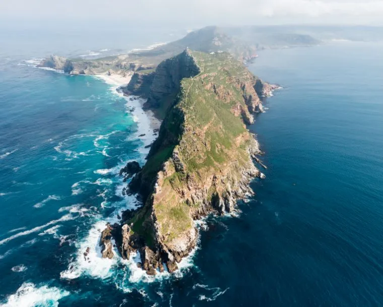 Cape Point is a promontory at the southeast corner of the Cape Peninsula, which is a mountainous and scenic landform that runs north-south for about thirty kilometres at the extreme southwestern tip of the African continent in the Republic of South Africa. Table Mountain and the city of Cape Town are close to the northern extremity of the same peninsula. The cape is located at about 2.3 kilometres (1.4 mi) east and a little north of the Cape of Good Hope on the southwest corner.[1] Although these two rocky capes are very well known, neither cape is actually the southernmost point of the mainland of Africa; that is Cape Agulhas, approximately 150 kilometres (93 mi) to the east-southeast.
