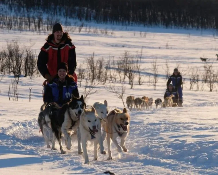 Drive your own team of huskies! This is an experience out of the ordinary and a must-do for anyone visiting Northern Norway. The dog sled has been used for centuries throughout the Arctic region, mainly for travel, hunting, and transportation. Now it’s your chance to get closer to the raw nature of the Arctic and try this adventurous way of travelling. All tours depart from outside the Scandic Ishavshotel, where you will be picked up for a scenic 50-minute transfer to our camp in Breivikeidet. Upon arrival at our camp in Breivikeidet, situated in a picturesque valley close to the sea, you will be welcomed by our friendly staff. We will provide you with polar insulated suits, boots, hats, and mittens before heading out on the dog sledding adventure. Before meeting the huskies, your guide will go through the safety instructions and show you the basics of driving the sled. You don’t need any previous experience: after listening carefully to the demonstration and a few minutes of practice, you’ll enjoy driving on the open fields and inside the forest trails.