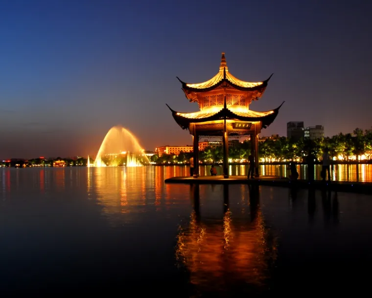 Hangzhou - the capital of China’s Zhejiang province, is the southern terminus of the ancient Grand Canal waterway, which originates in Beijing. Its West Lake, celebrated by poets and artists since the 9th century, encompasses islands (reachable by boat), temples, pavilions, gardens and arched bridges. On its south bank is 5-story Leifeng Pagoda, a modern reconstruction of a structure built in 975 A.D.