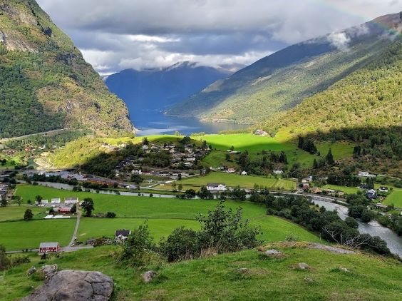 Flåm is a village in southwestern Norway, in an area known for its fjords. It sits at the end of Aurlandsfjord, a branch of the vast Sognefjord. The dramatic Stegastein viewing platform juts out high above the Aurlandsfjord. South of Flåm Harbor, the 17th-century wooden Flåm Church lies in the valley. The Flåm Railway offers valley and waterfall views as it climbs to a station on the Hardangervidda plateau.
