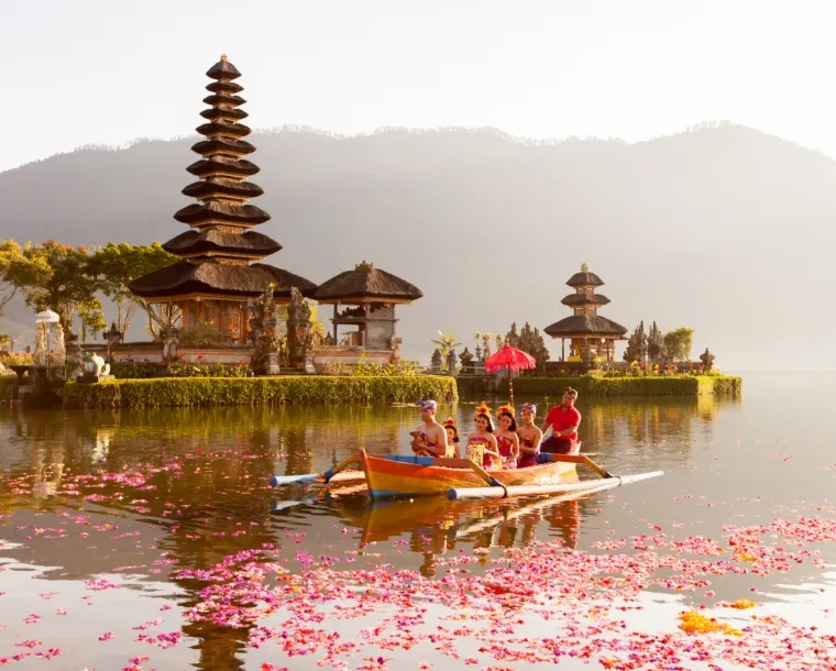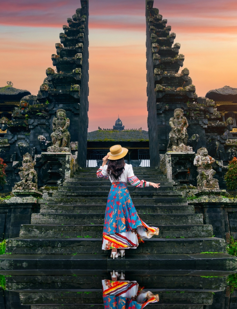 Bali is an Indonesian island known for its forested volcanic mountains, iconic rice paddies, beaches and coral reefs. The island is home to religious sites such as cliffside Uluwatu Temple. To the south, the beachside city of Kuta has lively bars, while Seminyak, Sanur and Nusa Dua are popular resort towns.