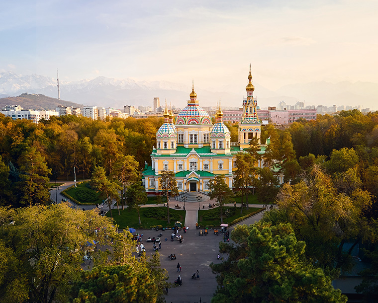 Kazakhstan - a Central Asian country and former Soviet republic, extends from the Caspian Sea in the west to the Altai Mountains at its eastern border with China and Russia. Its largest metropolis, Almaty, is a long-standing trading hub whose landmarks include Ascension Cathedral, a tsarist-era Russian Orthodox church, and the Central State Museum of Kazakhstan, displaying thousands of Kazakh artifacts.