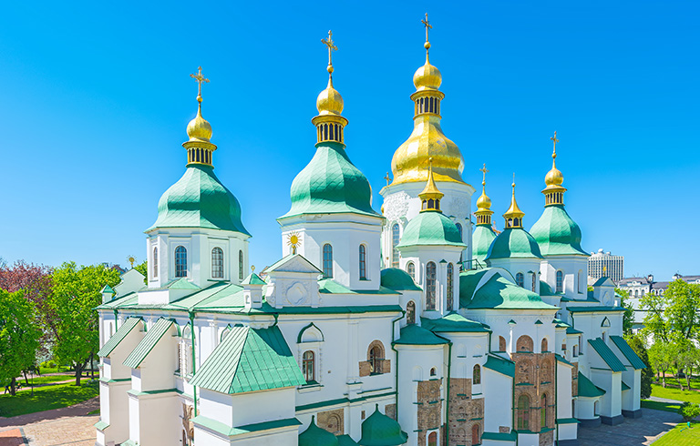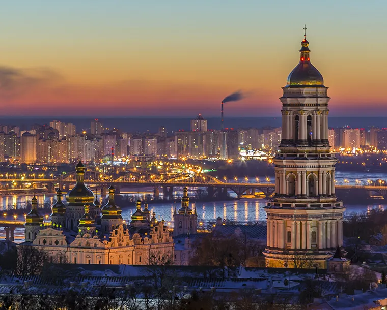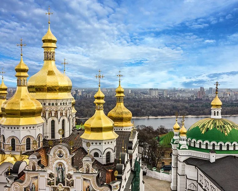 Ukraine: Ukraine is a large country in Eastern Europe known for its Orthodox churches, Black Sea coastline and forested mountains. Its capital, Kiev, features the gold-domed St. Sophia's Cathedral, with 11th-century mosaics and frescoes. Overlooking the Dnieper River is the Kiev Pechersk Lavra monastery complex, a Christian pilgrimage site housing Scythian tomb relics and catacombs containing mummified Orthodox monks. Kiev is the capital city of Ukraine, bisected by the Dnieper River and known for its religious architecture, secular monuments and history museums. The 11th-century Kiev Pechersk Lavra is a monastery and pilgrimage site encompassing several gold-domed churches. It's known for its catacombs lined with the burial chambers of Orthodox monks, and a collection of gold objects from ancient Scythian times.