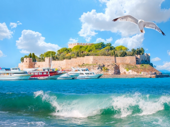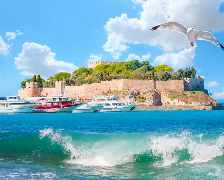 Kuşadası is a beach resort town on Turkey’s western Aegean coast. A jumping-off point for visiting the classical ruins at nearby Ephesus (or Efes), it’s also a major cruise ship destination. Its seafront promenade, marina, and harbor are lined with hotels and restaurants. Just offshore on Pigeon Island is a walled Byzantine castle that once guarded the town, connected to the mainland via causeway.
