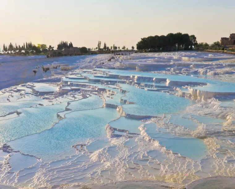Pamukkale is a town in western Turkey known for the mineral-rich thermal waters flowing down white travertine terraces on a nearby hillside. It neighbors Hierapolis, an ancient Roman spa city founded around 190 B.C. Ruins there include a well-preserved theater and a necropolis with sarcophagi that stretch for 2km. The Antique Pool is famous for its submerged Roman columns, the result of an earthquake.