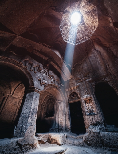 Geghard is a medieval monastery in the Kotayk province of Armenia, being partially carved out of the adjacent mountain, surrounded by cliffs. It is listed as a UNESCO World Heritage Site with enhanced protection status.
