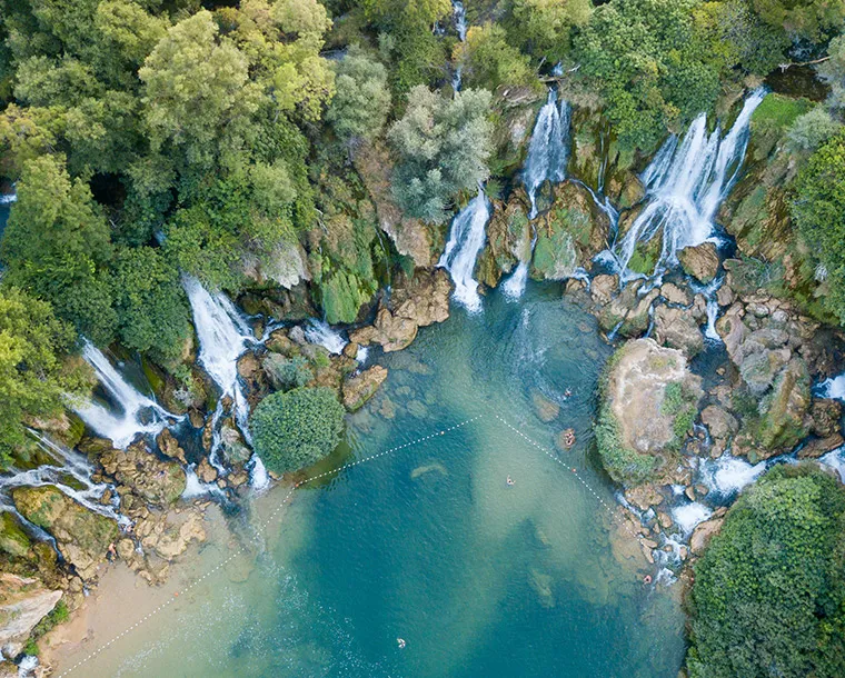 An areal view of the town of Jajce in Bosnia & Herzegovina. The most visited destination in Bosnia attracts tourists to Stari Most. Combine this with a special mixture of Bosniak and Croat cultures on either side of the river, and visitors get two very different experiences. Kujundziluk is Mostar’s Ottoman Bazaar, full of stalls and branching alleys. The Croat side houses Cathedral of Mary, Mother of the Church, and shaded avenues with a Croatian charm.