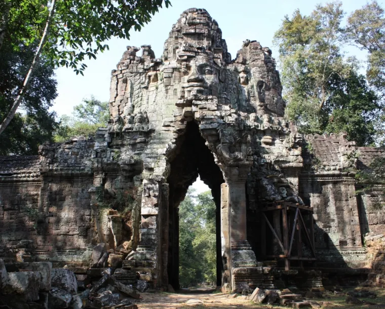 Siem Reap, a resort town in northwestern Cambodia, is the gateway to the ruins of Angkor, the seat of the Khmer kingdom from the 9th–15th centuries. Angkor’s vast complex of intricate stone buildings includes preserved Angkor Wat, the main temple, which is pictured on Cambodia’s flag. Giant, mysterious faces are carved into the Bayon Temple at Angkor Thom.
