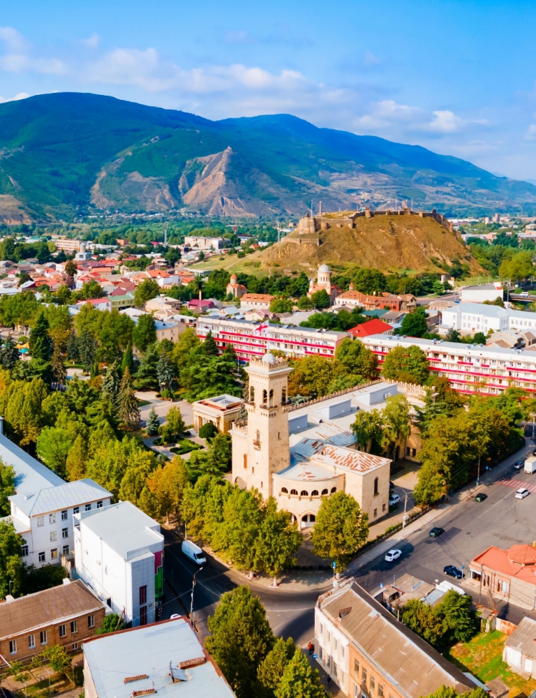 Gori is a city in eastern Georgia, which serves as the regional capital of Shida Kartli and is located at the confluence of two rivers, the Mtkvari and the Liakhvi. The name comes from a Georgian word gora, meaning "heap", or "hill"., or a mountain.